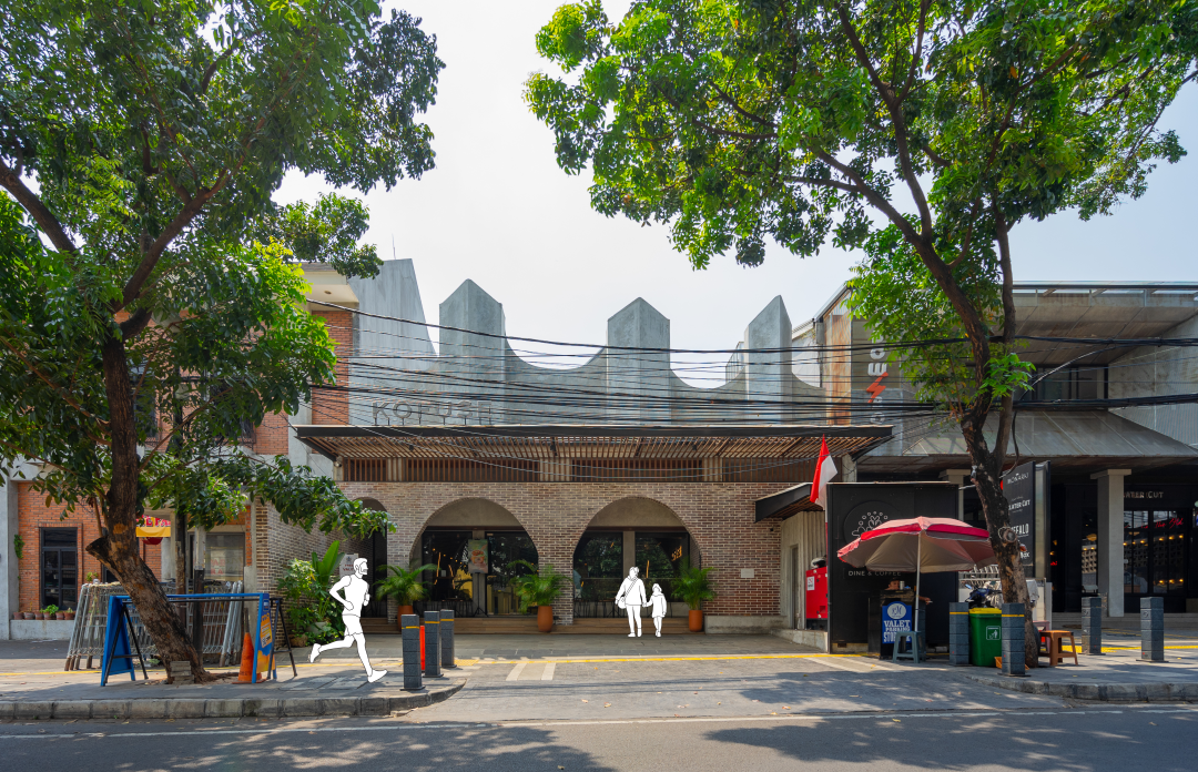 Kofuse Coffee & Dine is an F&B project made for the brand of Kofuse Retro Fit Artisan Fine Dining, located on Cikajang Street, Kebayoran Baru, South Jakarta. It is a renovation project from a previous nail art and spa building. Almost 75% of the existing structure is re-used. Some structural columns with an arch shape are added to strengthen the roof structure. The arch columns are also applied to the facade as an additional structure to support the canopy we made to shade the inner building from direct sunlight and heavy rainfall, considering its context in the tropical climate of Indonesia. The arch shape of the columns is then mirrored to the top, making the impression of minarets. The facade is illuminated by the lighting path, giving a dramatic effect once we enter the site at night and standing out the minarets as an anchor point on the face of the T-section.