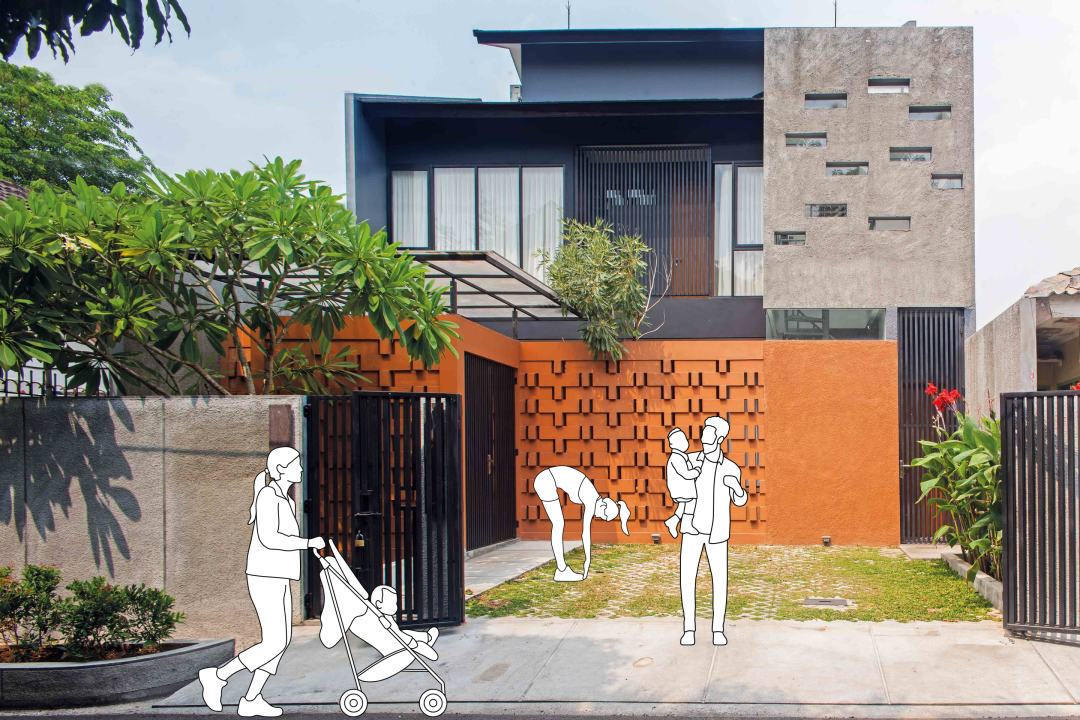 Located in Taman Meruya Ilir, West Jakarta region, Istakagrha meaning brick house, Situated in the increasingly crowded West Jakarta area, the 150 sqm house occupies a 150 sqm plot of land, 10m x 15m. Istakagrha is reflected by its name, brick House, it is a small and compact house with a orange painted color on the light weight brick, black colour , and rough concrete texture finishes.The expression creates humble and distinctive look.