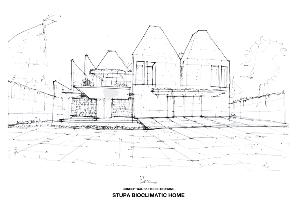 Stupa is a house like a Castle inspired by Stupa or tapered traditional masonry temple of Indonesian architecture. This form has been exercised in the Guha project and Istakagrha (meaning bricks house), marking the continuation of the experimentation process in the studio. Stupa also means stupa home, a space for meditation, forming a temple or sanctuary for the family.