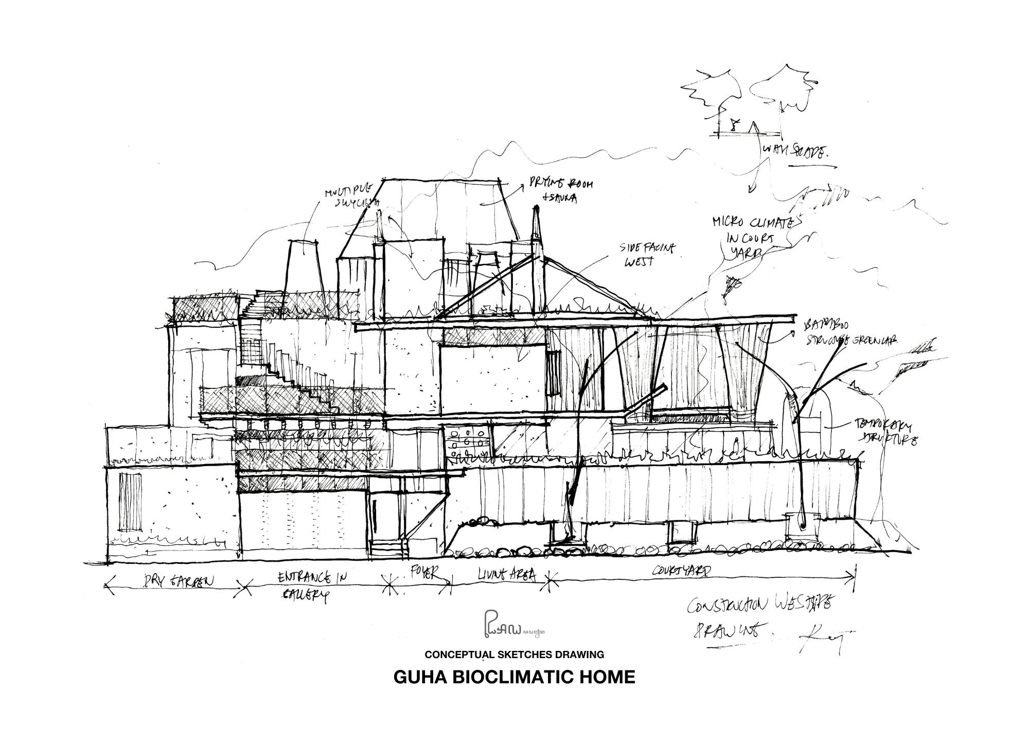 Construction of Guha is elaborated into 9 materials, to sum up, craftmanship experimentation in Realrich Architecture Workshop such as steel, wood, glass, metal, gypsum, bamboo, plastic, stone, and concrete. The layout is flexible, and open while some of the rooms are opened by a minimum of 2 doors allowing further scenarios while the program can be changed. The idea is basically addressing the tropical climate to open north-south and close the facade on the west side. The Facade is basically basic material, concrete, vertical louver by steel and bamboo. The program it self challenge the typical housing in Indonesia to be mixed with more micro business programs such as education, even coffee shop in the future by maintaining the privacy and opening itself to the public. The construction is done by generations of craftsmen from west java which integrate some traditional fish mouth joint in bamboo construction and more modern construction methods such as steel and construction.