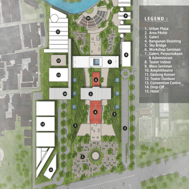 The design of the Galeri Nasional complex is based on the intention to maintain the image of the heritage building whose plot is only 70 meters wide; quite small when compared to the width of the heritage building itself, which is 22 meters. Therefore, the design intervention chosen for this site is landscape as the side architecture of the museum, flanking the heritage building. Connectivity is maintained through a public access from the Monumen Nasional (Monas) to the art shop in the central space of the gallery through underground tunnel. In the master plan, this connectivity issue is continued to the Ciliwung River, allowing art activities on its banks.
