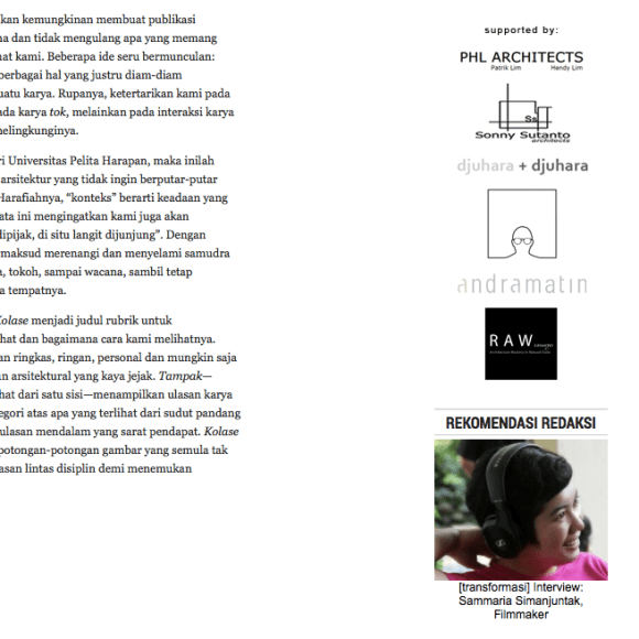 Sketsa, Tampak, Perspektif dan Kolase menjadi judul rubrik untuk menggambarkan apa yang kami lihat dan bagaimana cara kami melihatnya.Sketsa—sebagai alegori dari catatan ringkas, ringan, personal dan mungkin saja tidak tuntas—menampilkan kilasan arsitektural yang kaya jejak. Tampak—sebagai alegori dari apa yang terlihat dari satu sisi—menampilkan ulasan karya atau acara. Perspektif—sebagai alegori atas apa yang terlihat dari sudut pandang tertentu—menampilkan berbagai ulasan mendalam yang sarat pendapat. Kolase—sebagai alegori dari perpaduan potongan-potongan gambar yang semula tak berhubungan—menampilkan bahasan lintas disiplin demi menemukan pemahaman segar.