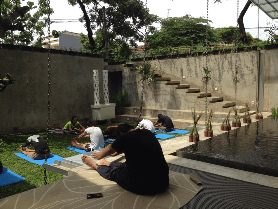 Then I read one book titled, Originals written by Adam Grant. he wrote when you want to change something, building a condition, system that make you to change, change your behavior, you can’t do it yourself, you need other people. In my mind, I thought, “okay I need a trainer.” I asked Rezki and Greg, that I wanted to do Yoga, and they introduced me to Feliz. Then at bright morning, the yoga started.