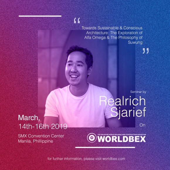 Realrich Sjarief invited to be part of The Worldbex Seminars 2019 Manila, Philippine. RAW (Realrich architecture Workshop) Architecture’s design director Ar. Realrich Sjarief will share talk on “Sustainable and Conscious Architecture, Exploration of Alpha Omega, and the Philosophy of Suwung.” The event is a sharing, presentation and discussion together with practicioners in Singapore, Philipines, Thailand. The 2019 Event Theme is “A World Built Bolder.”
