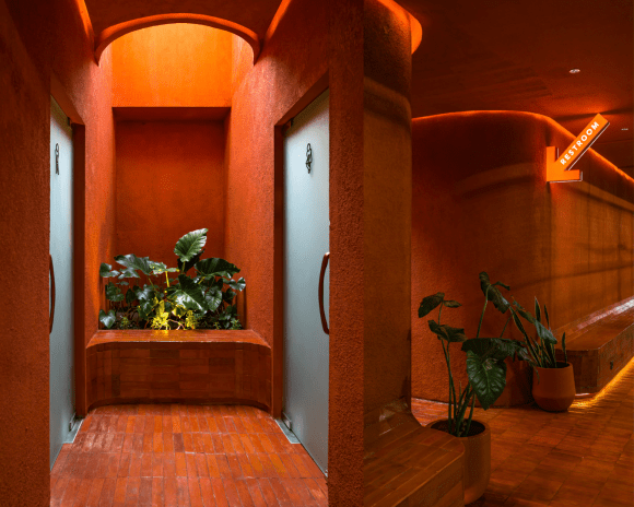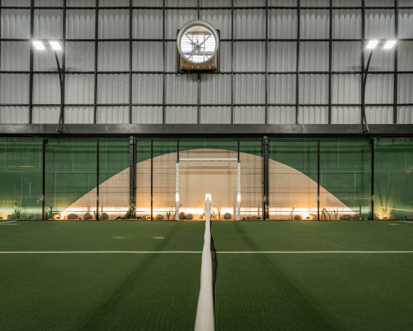 Material choices emphasize efficiency and restraint. Locally sourced stone, exposed steel, and brick are paired with transparent and perforated surfaces to create a tactile yet breathable architecture. Through this approach, form, climate response, and detailing come together to define Wonderball Padel as a performative and context-driven sports facility.
