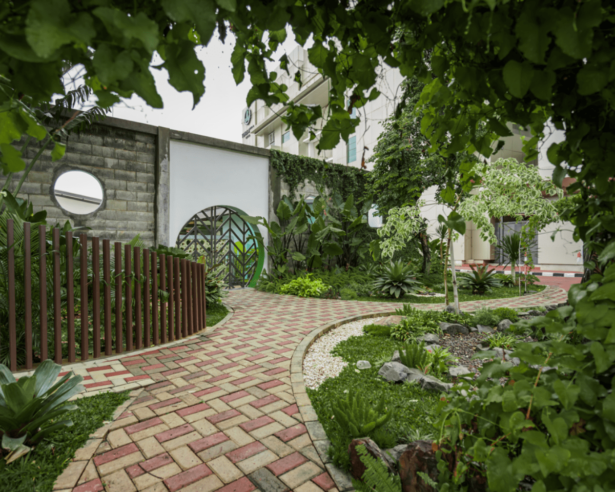 The design strategy also utilizes the existing level difference (almost a meter drop from ground level) in order to minimize land cut and fill, which later turned into a welcoming arrival area by employing ramp and stairs.