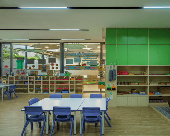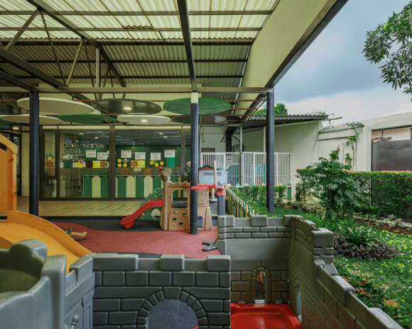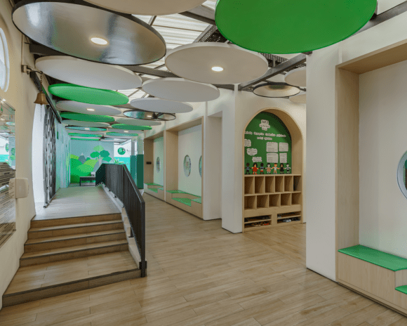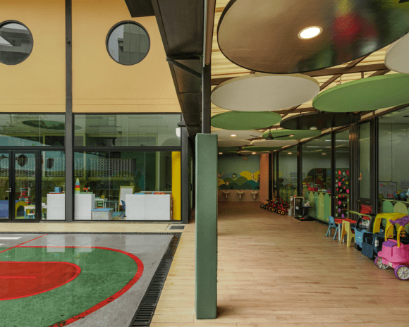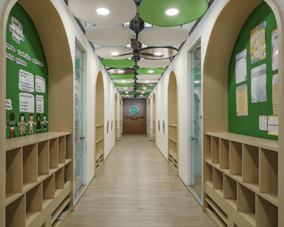 Located in Jakarta, Tunas Muda Kindergarten’s architectural design approach begins with consciousness of the historical context by preserving the existing walls, columns, and foundations as the basis for the new order. In detail, the design maintain the existing creepers along the perimeter wall, combined with a circular door and entrance pathways softened by curved geometries. It aims to create a child-friendly and approachable environment.