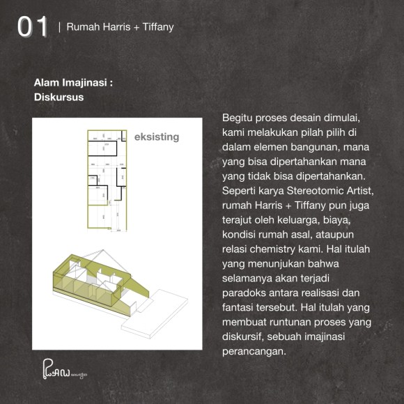 For me, working in the studio gives me the reality of architecture. It’s about process, long way to go until something can be called as finished. I learned a lot about the stages of creating something, start from basic research, site analysis, also massing form with efficiency and suitable program. All the stages have to be cleared and well prepared before we can create a good architecture. Giving alternatives also important, to show our process of learning, also to prove that we are not selfish in designing something based on our own opinion. Take a look at many references before you design to achieve the goal that clients wanted. It’s only a month and a half of learning process, but it had opened my mind somehow about being an architect. RAW studio is full of good-hearted people with creative thoughts and they like to share what they’ve got to complete each other. I like being surrounded with those great architects with creative minds, especially with the leadership of Mr. Realrich, RAW’s principal who gave me so much knowledge about architecture. All of this working process is like an important experience for an architecture student that cannot be given from another place.