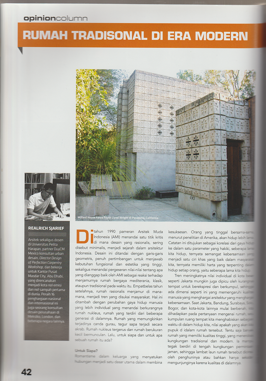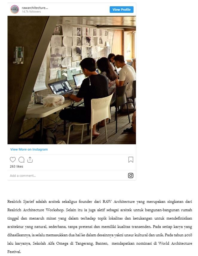 Realrich Sjarief is in 50 Indonesian architects + Emergings book by Imelda Akmal Architecture Writer. Here is the description by Jakarta Post : Over the past decade, Indonesian architects have redefined and rediscovered Indonesian architecture. By consistently building and experimenting, they have created a new face for contemporary Indonesian architecture.