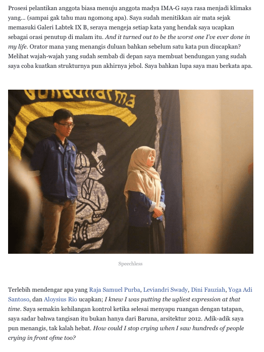 Lady mantan sekertaris jendral IMA G berkata sambil setengah bercanda, “Rich mimpi lo sudah tercapai, mezanine Ruang Gunadharma, sudah selesai dibuat sama anak – anak. ” pada waktu itu adalah pelantikan anggota madya, kelulusan sebagai anggota IMA G di tahun 2005 kira – kira sebelas tahun yang lalu . Terus terang sudah beberapa tahun ini, diri ini sibuk di ibu kota Jakarta, dan jarang bersentuhan dengan dunia kemahasiswaan. Tuntutan hidup di Jakarta yang mengukung dari hari Senin dan Jumat, briefing demi briefing, coretan demi coretan mewarnai keseharian. Di hari sabtu dan minggu, omah library juga beraktifitas untuk membuat orang di dalamnya belajar dan belajar menjadi arsitek yang lebih baik lagi.
